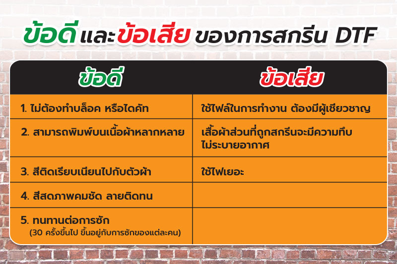 อ่านมาถึงตรงนี้หลายคนอาจจะคิดว่าการพิมพ์ dtf เป็นการพิมพ์ที่ง่าย ไม่ยุ่งยากเหมือนจะมีแต่ข้อดีใช่มั้ยคะ แต่จริงๆ แล้วงานสกรีน dtf ก็มีข้อเสียเหมือนกัน มาดูกันดีกว่าว่าข้อดีและข้อเสียมีอะไรบ้าง
